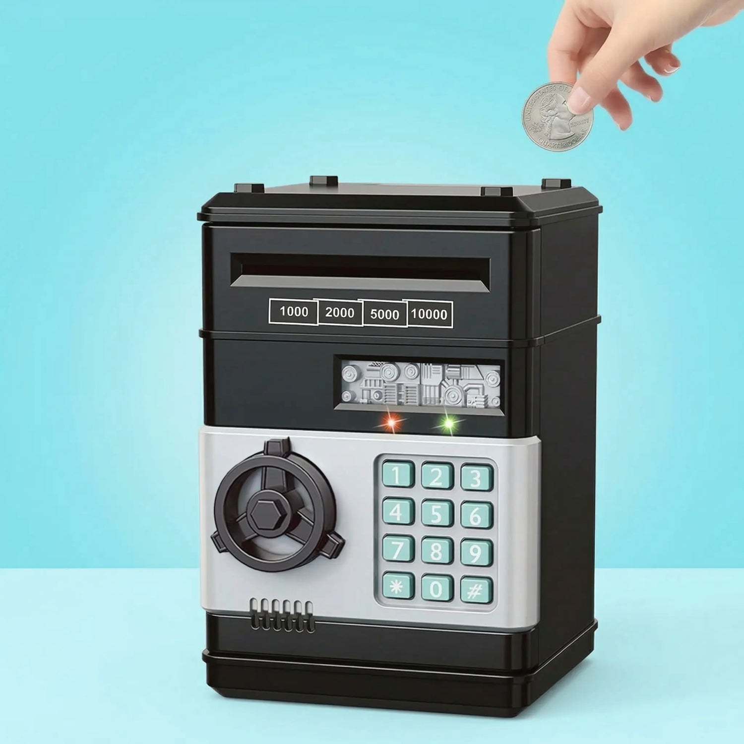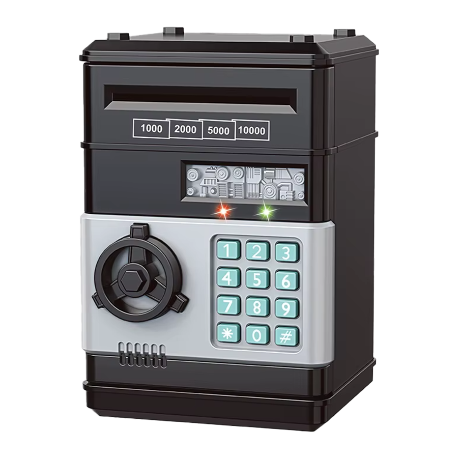 Kids can insert coins through the top slot or feed banknotes into the front slot, where the bank automatically pulls the money inside. To open it, they simply enter the 4-digit password and turn the knob like a real mini safe.